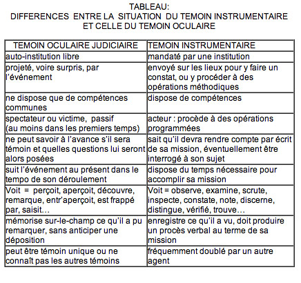 Après avoir précisé le contraste entre les définitions des deux types de témoins, l’auto-institution par « j’y étais » dans un cas et le mandat délivré par l’institution judiciaire à une personne assermentée dans l’autre, on peut inventorier, sans réduire la disparité des fonctions recouvertes par ces auxiliaires de la justice, les oppositions entre la situation du témoin instrumentaire et celle du témoin oculaire (tableau p. 4).