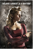 La figure 3 reprend l’énoncé « Once upon a time in Nazi occupied France… », accompagnant cette fois le casque ensanglanté d’un soldat allemand, maintenu triomphalement par un bâton de baseball où des noms juifs apparaissent sous la forme de graffiti. Les figures 2 et 4 misent sur les stéréotypes des affiches de cinéma. Dans la première, le héros, incarné par Brad Pitt, se détache, avançant avec assurance, poignard à la main, flanqué de ses compères armés jusqu’aux dents, tandis qu’en arrière-plan, selon le même principe de la triade, apparaît le visage surdimensionné du « méchant », encadré par les deux « femmes fatales » du film. Cet arrière-fond, véritable affiche dans l’affiche, évoque par son rouge vif à la fois la violence du film (le rouge étant la couleur du sang) et son caractère « sexy ». À la manière des héroïnes de films d’espionnage ou de films noirs, les deux femmes tiennent un revolver. Ainsi, l’espace dans lequel semblent évoluer les six personnages du film est circonscrit par des armes qui pointent vers l’extérieur; l’image elle-même tend à sortir de son cadre sous l’effet des différents points de fuite créés par la position des armes. Seul le visage hautain de l’officier nazi paraît retenir l’ensemble des éléments dans l’image, visage sans arme, ou plutôt, visage constitué lui-même en arme, incarnation du bourreau. La figure 4 reprend celle de la femme fatale, armée et décolletée, au-dessus de laquelle on peut lire l’énoncé percutant, voire paradoxal : « Mélanie Laurent is a Basterd ». L’attribution à l’actrice, plutôt qu’au personnage, d’un élément de la fiction (les bâtards), annonce le jeu jubilatoire auquel invite le film entre histoire et fiction.